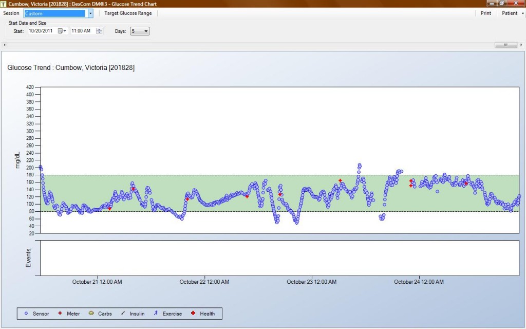 While your diabetes may vary, my personal goal is to stay below 180 mg/dL, but I’m happy as long as I don’t cross 200. And for the past five days, I’ve done just that. (Cause I’m counting a 204 mg/dL reading as close enough). Therefore, I have no idea what’s going on, but I do know I like it. And if this keeps up, my A1c in four months is going to be worth throwing a party for… with plenty of Diet Cokes and grilled cheeses. (long story).
