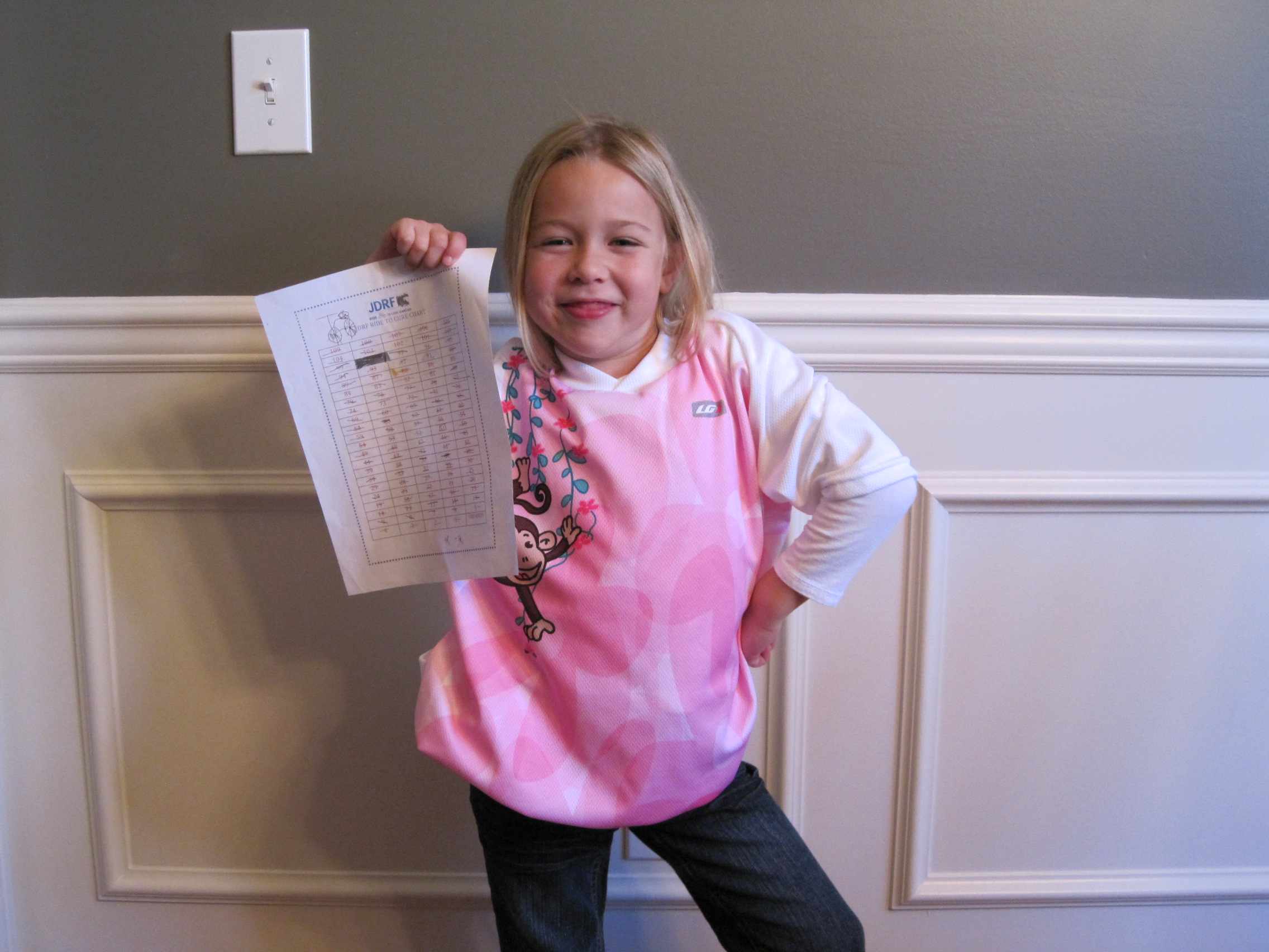 A while back, I was challenged to a dual. Not the sword-fighting, bee-mask kind of a dual, but a who-can-ride-109-miles-first-on-a-bike kind of a dual. My challenger was a 6-year-old cutie who goes by the online name of Squeakers. She’s 3-feet, 6-inches of pure brute strength. Actually, she’s a big pile of adorableness right down to her blonde pigtails. Squeakers was diagnosed with type 1 diabetes when she was 2 years old. Since then, her parents (Ross and Sarah) have been involved in JDRF Walks and fundraising efforts to help Squeakers down the road. In fact, her mom is a SUPER D-MOM! In addition to taking excellent care of Squeakers, she’s our local JDRF Outreach Coordinator (volunteer), she is on the Walk committee, she heads up our Mentor coordinating, she’s the Family Team co-chair and she’s the Hot Shots co-chair. Oh, and she still finds time to tweet at @mod4acure. Along with her husband, Sarah is an amazing advocate, and I’m so thankful we are friends (in real life).